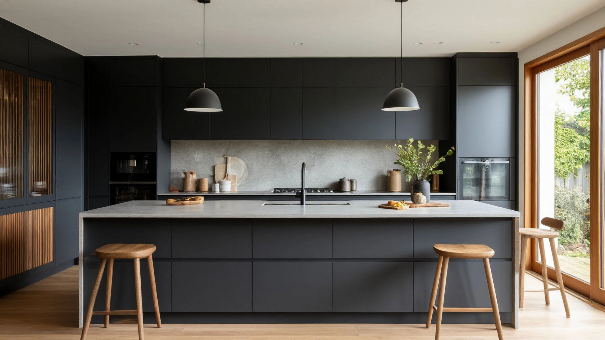 Фасады кухни в цвете графит плавно сочетаются с светло-серой столешницей и деревянными деталями, создавая ощущение целостности, строгости и естественности одновременно. Каждый элемент продуман, каждая линия и оттенок имеют значение, а общая гармония интерьера делает кухню "Асано" образцом стиля джапанди, где функциональность, комфорт и эстетика соединены воедино.
