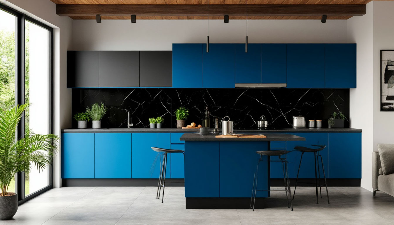 Каждая деталь этой кухни продумана до мелочей. Черные фасады с матовой текстурой создают ощущение глубины, а синие акценты на ручках и фартуках придают пространству живость и энергетику. Такое цветовое сочетание не только привлекает внимание, но и создает атмосферу уюта и стиля. Удобные шкафы и ящики обеспечивают достаточное место для хранения, позволяя организовать пространство так, чтобы все необходимое было под рукой. Современные технологии, используемые в производстве мебели, делают процесс приготовления пищи легким и приятным, а также способствуют экономии времени.