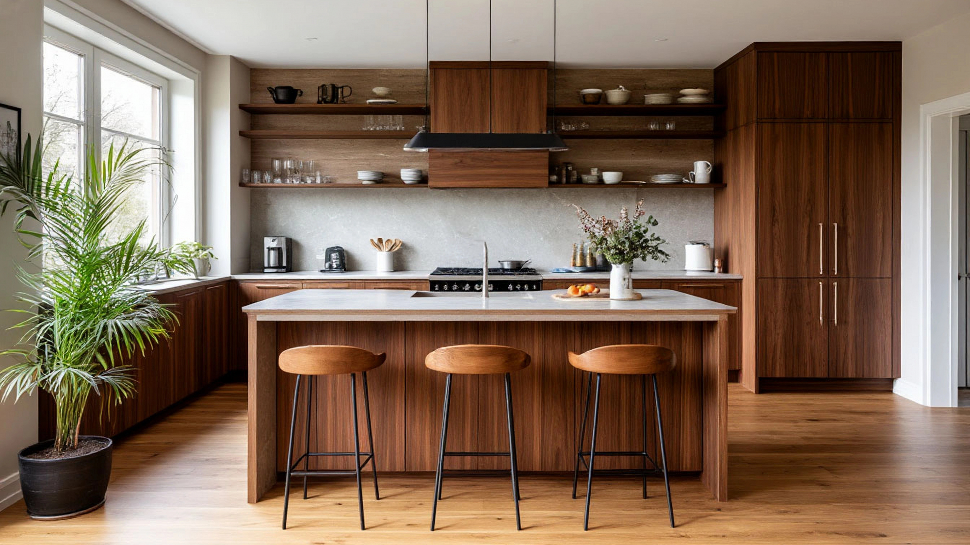 "Элинор" будто создана для тех, кто чувствует красоту естественного. В её образе нет ни показной роскоши, ни стремления поразить. Всё, что здесь важно, — это честность материала, чистота линий, тепло оттенка. Ореховый фасад словно дышит — он не просто передаёт текстуру дерева, а живёт вместе с ним. В солнечный день он становится чуть золотистым, в вечернем свете — тёплым и глубоким, как янтарь. Это кухня, которая умеет меняться, как живое пространство, отражая настроение дома и тех, кто в нём живёт.