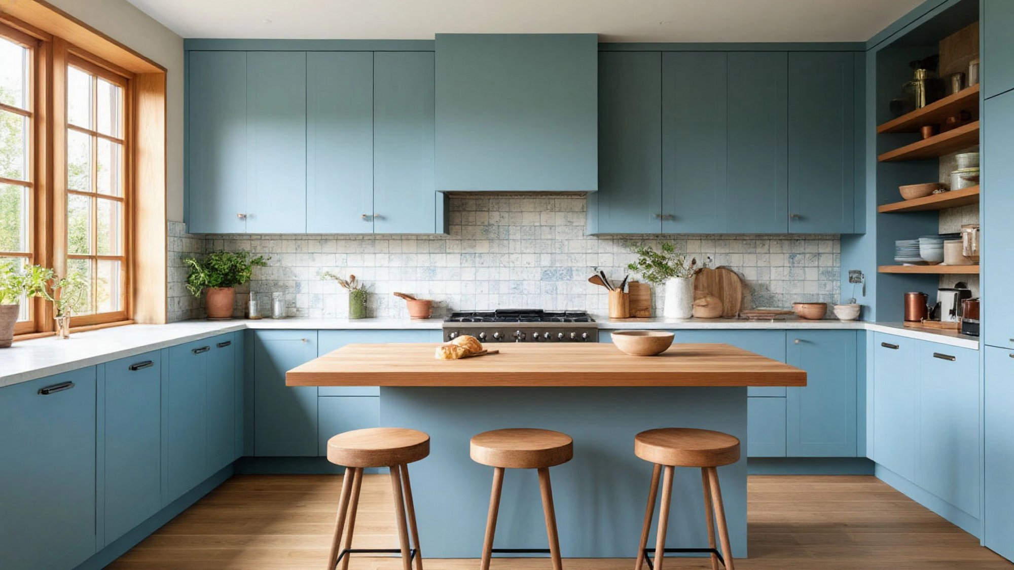 В интерьере кухни "Мацура" особое место занимает дерево. Его тёплая фактура на поверхности острова делает голубой цвет особенно выразительным. Светлые рабочие столешницы в сочетании с открытыми полками создают ощущение природной целостности. Они не просто украшают кухню, они дышат вместе с ней. Дерево смягчает строгость форм, делает пространство живым, человеческим. В нём чувствуется дыхание природы, то, что делает дом настоящим. Комбинация голубого и дерева — это как небо и земля, вода и камень, инь и ян — естественный союз противоположностей, на котором и основана философия джапанди.