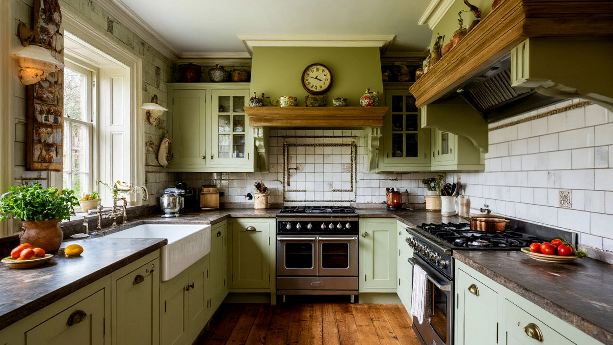 Цветовая палитра кухни в английском стиле выбрана с учётом гармонии и светопроницаемости. Кремовые, бежевые и мягкие коричневые оттенки создают тёплую и спокойную атмосферу, а деревянные элементы добавляют натуральности и уюта. Контрастные детали, такие как металлические ручки, декоративная фурнитура и элементы освещения, добавляют строгости и элегантности, подчеркивая стиль и внимание к деталям. Пространство кухни воспринимается как единое целое, где каждая зона плавно переходит в другую, а интерьер остаётся воздушным и функциональным одновременно.
