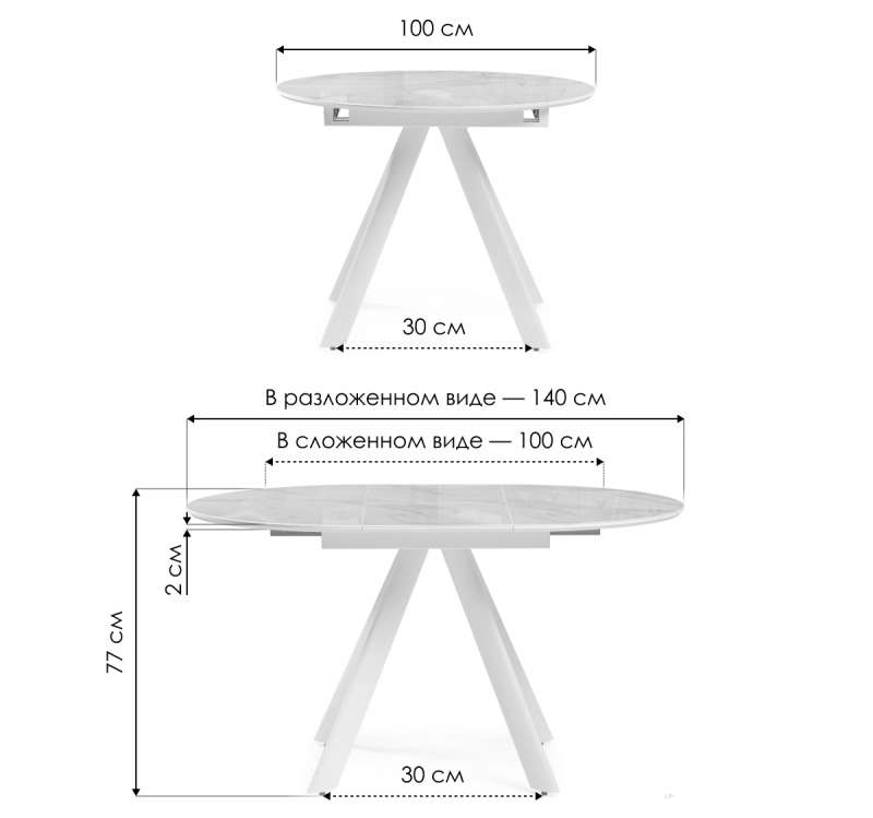 Расстояние между ножками: 30 х 30 см. Толщина столешницы: 2 см.