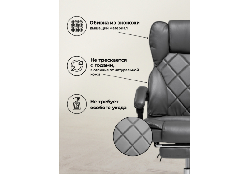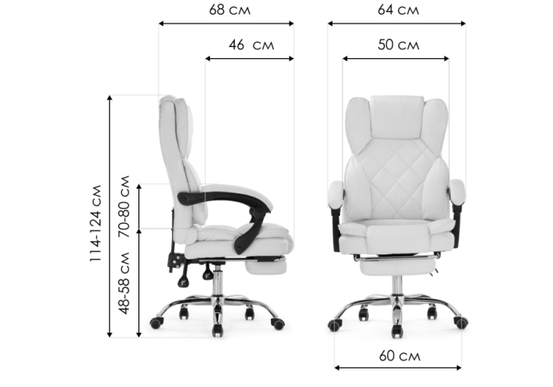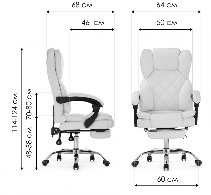 Высота подлокотников: 70 - 80 см. Высота спинки: 69 - 74 см. Диаметр крестовины: 60 см.